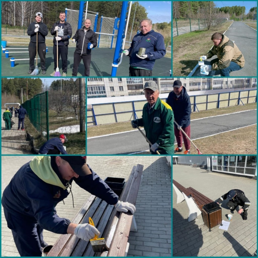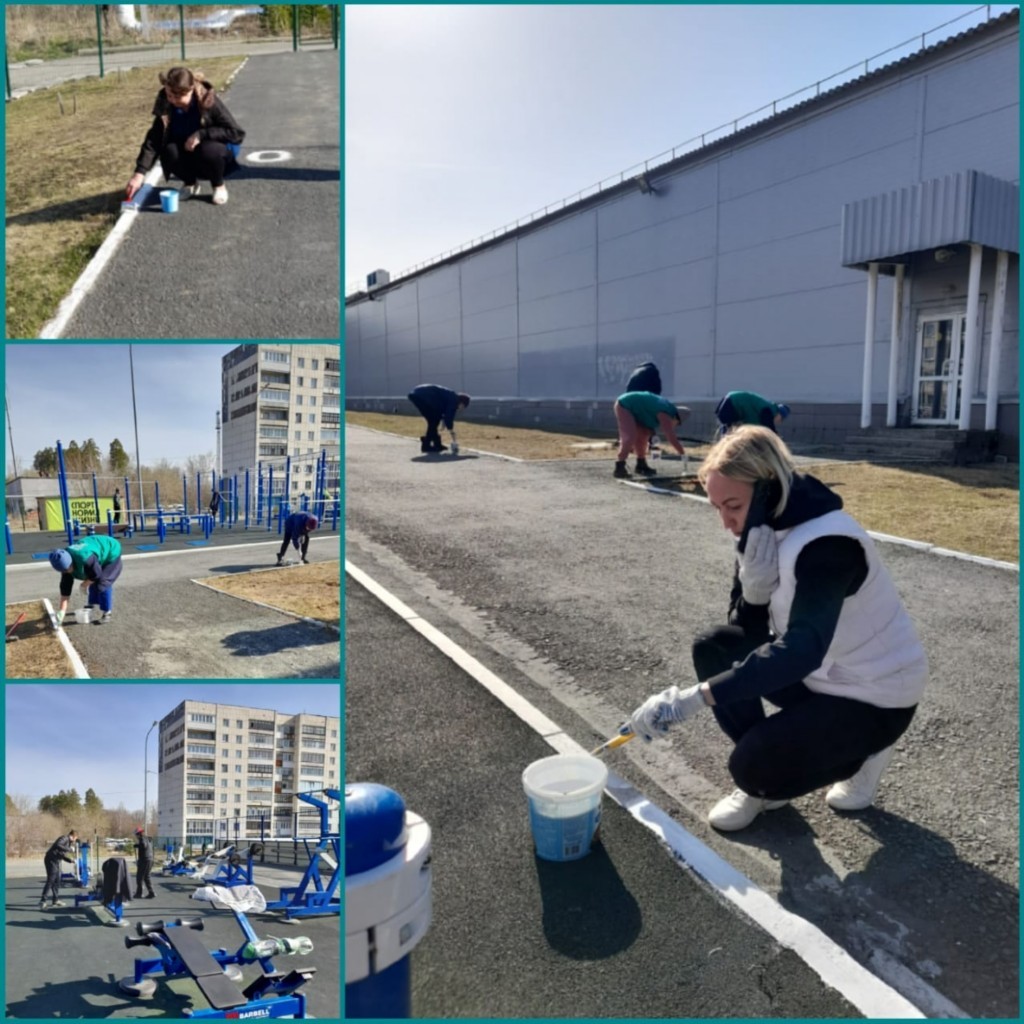 Во время субботника светило яркое солнышко, пели птицы, все участники мероприятия с удовольствием убирали старую траву и листву с газонов, красили бордюры, освежили площадку ГТО.
